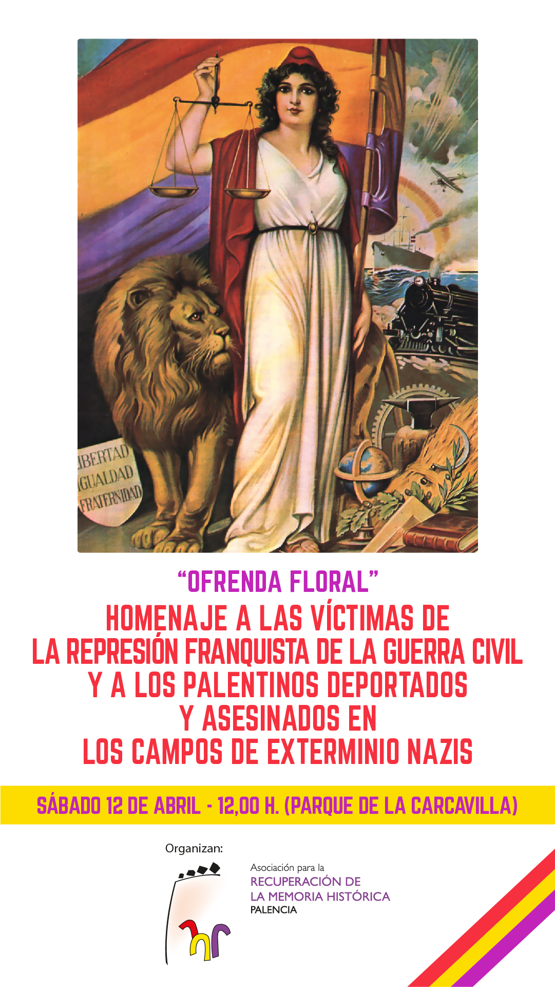 Organizado por la Asociación para la Recuperación de la Memoria Histórica de Palencia, el próximo sábado 12 de abril , tendrá lugar en el Parque de la Carcavilla , a las 12 horas , el acto homenaje a las víctimas de la guerra civil ya los represaliados por el franquismo, así como a los palentinos deportados y asesinados en los campos nazis, en este 94 aniversario de la celebración de la II República.