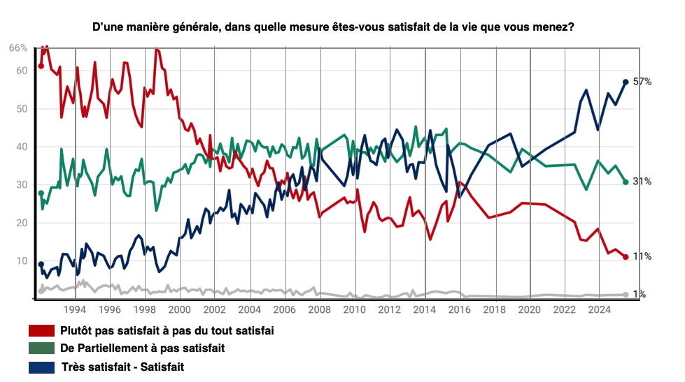II En julio de 2025, la satisfacción de los encuestados con su vida alcanzó su nivel más alto desde 1993, con un 57% de respuestas. Mientras tanto, la proporción de encuestados insatisfechos con su vida alcanza su nivel más bajo desde 1993, con un 11%.