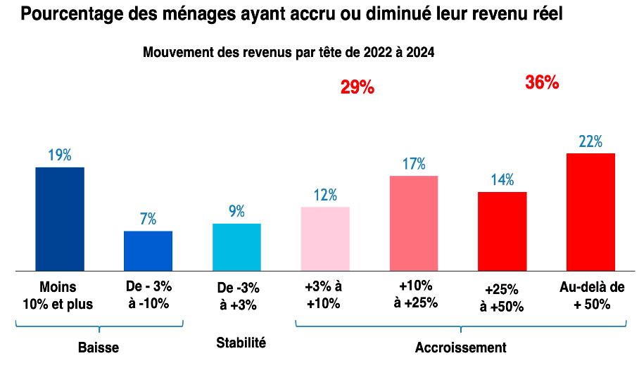 XV El impacto muy positivo de la situación económica desempeña un papel importante en la » satisfacción con la situación actual. El 65% de los hogares ha visto mejorar sus ingresos reales desde 2022, y para el 36% esto supone un aumento de al menos el 25%.