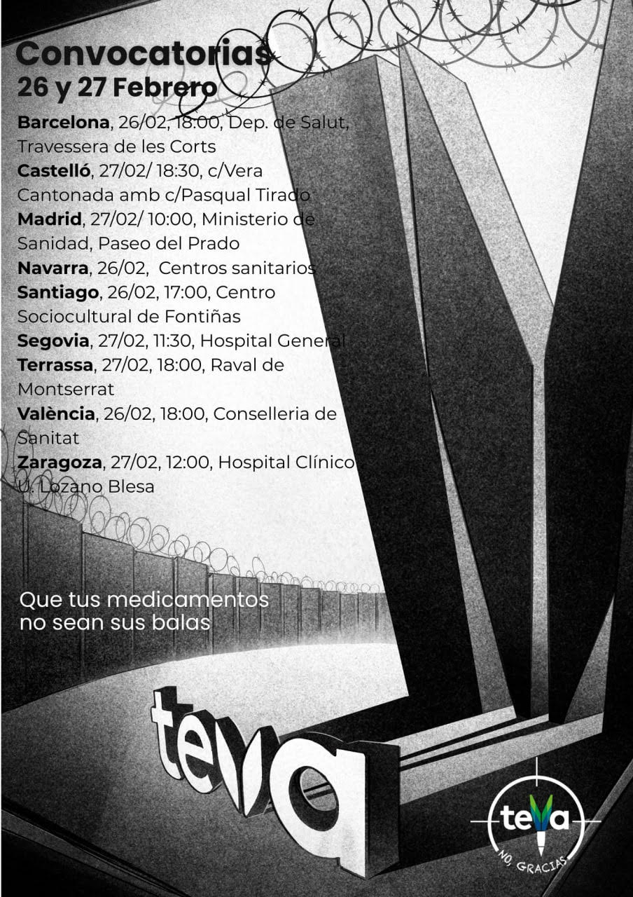 Como sabéis, Teva, empresa farmacéutica israelí líder en el mercado de genéricos, también a nivel español, financia el estado sionista y participa activamente en el sistema de apartheid y ocupación de Palestina, siendo cómplice del genocidio al pueblo palestino. Por este motivo, la sociedad civil damos inicio a una campaña que durará todo el año para romper esta cadena de complicidad desde la calle, la consulta, la farmacia y las instituciones, utilizando la legítima e histórica herramienta de boicot, promovida por el movimiento internacional Boicot, Desinversión y Sanciones (BDS) a Israel.